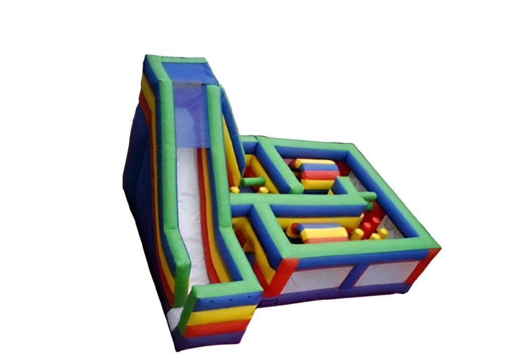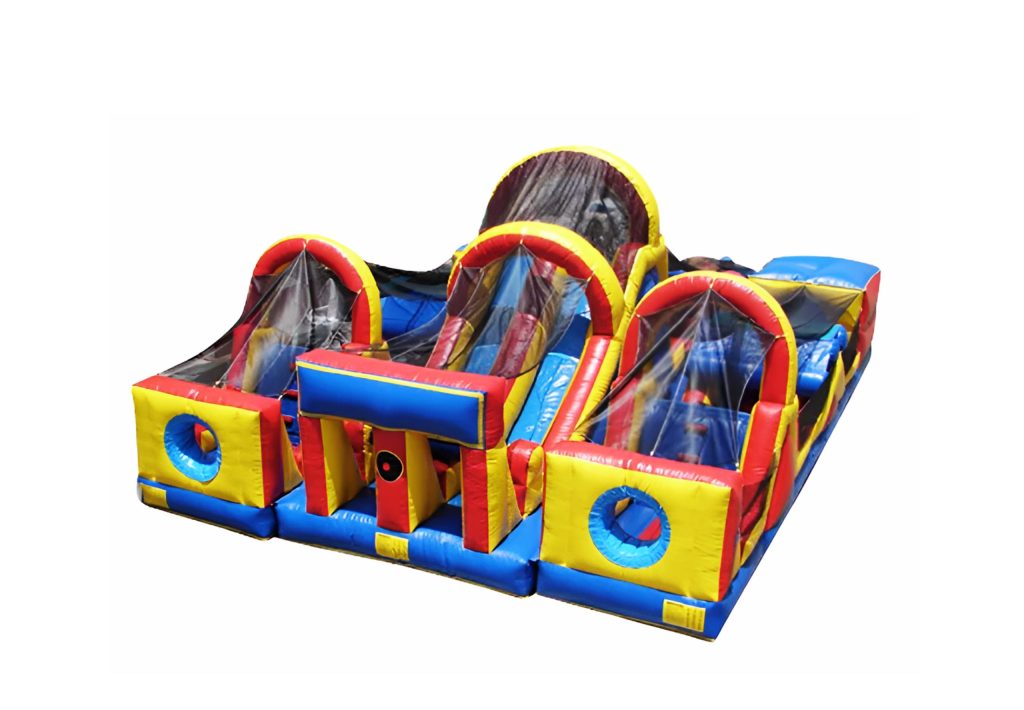 This is the 360 Obstacle Course Extreme. This Obstacle/Maze is a 60′ obstacle course combined with a maze to have a footprint on the ground of only 24′ x 16′. This unit also has a very large slide built into it. Rent this unit for as low as $359 per day.